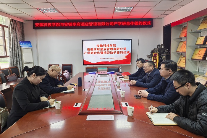 11月20日,食品工程学院与安徽李府酒店管理有限公司“产学研”合作暨捐资助学签约仪式在学院会议室举行。后勤保障部主任姚文均、研究生处处长张春雨和食品工程学院院长杜传来、副院长翟立公以及安徽李府酒店管理有限公司总经理辛国芳等出席签约仪式,仪式由杜传来主持。