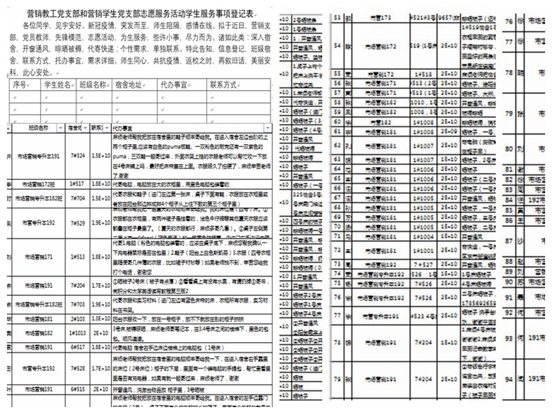 在龙湖校区德馨苑1号楼门前,营销教工支部和营销教工支部学生支部等7名党员教师按照时间约定准时集合。依据营销学生党支部统计整理的市场营销专业学生代办服务需求清单,分成三个小组,深入到德馨苑不同楼栋的各个宿舍房间,对照服务事项明细表,帮助学生开窗通风,晾晒被褥,整理衣服,扔掉垃圾、浇花,找出需要的待寄的衣服、鞋子、书籍、笔记本电脑、充电宝、行李箱等大小件物品,打包整理好统一移交快递公司等。在志愿服务过程中,不时与学生联系再次确认床位号,柜子位置,物品信息等,还及时与宿管、后勤联系维修更换宿舍门电池,柜子门锁等。经过近四个小时的紧张工作,各个小组再次集中在一起,汇报任务完成情况,核对快递包裹信息。初步统计,一共帮助市场营销专业10个班级的94位同学完成200多项任务,代寄24份包裹快递……党员教师虽然非常疲惫但倍感欣慰。