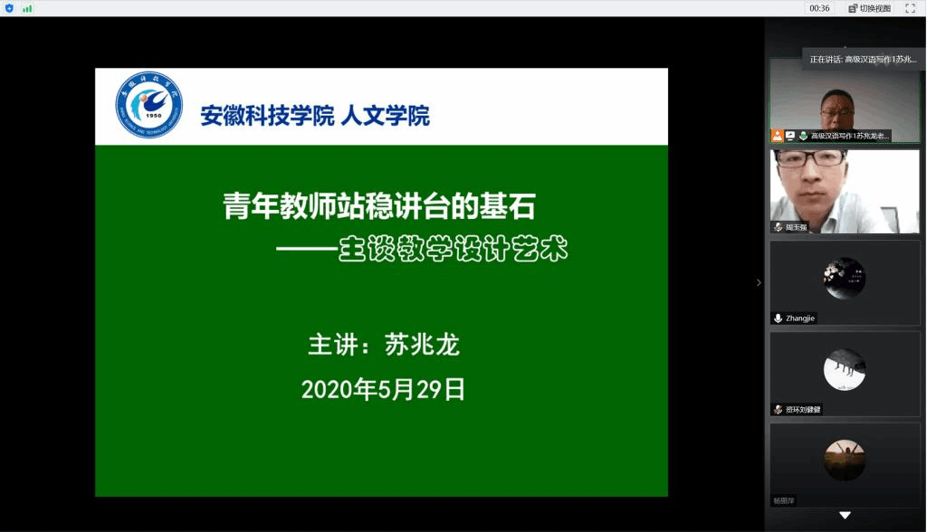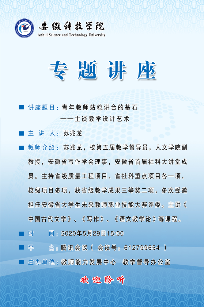 为帮助青年教师进一步提高课程教学设计水平,提升课堂教学质量,5月29日下午,由校教师能力发展中心、教学督导办公室主办,安徽省写作学会理事、安徽省首届社科大讲堂成员、校第五届教学督导员、人文学院副教授苏兆龙受邀作的题为“青年教师站稳讲台的基石——主谈教学设计艺术”专题讲座在腾讯会议线上平台开讲。讲座由教学督导办公室主任程斌主持,来自各教学院(部)的青年教师和部分教学督导员参加讲座。