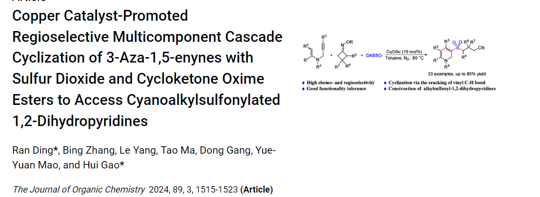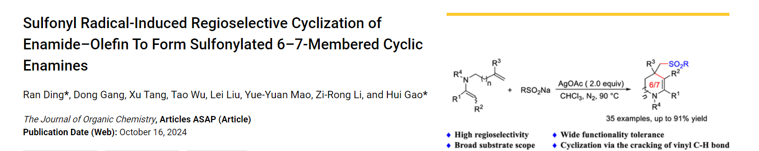 近日,李子荣教授团队在烯胺杂环合成上再次取得重要进展,相关成果以“Copper Catalyst-Promoted Regioselective Multicomponent CascadeCyclization of 3‑Aza-1,5-enynes with Sulfur Dioxide andCycloketone Oxime Esters to Access Cyanoalkylsulfonylated 1,2-Dihydropyridines”(图1)和“Sulfonyl radical-induced regioselective cyclization of enamide−olefin to form sulfonylated 6-7-membered cyclic enamines”(图2)为题发表在《The Journal of Organic Chemistry》期刊上。