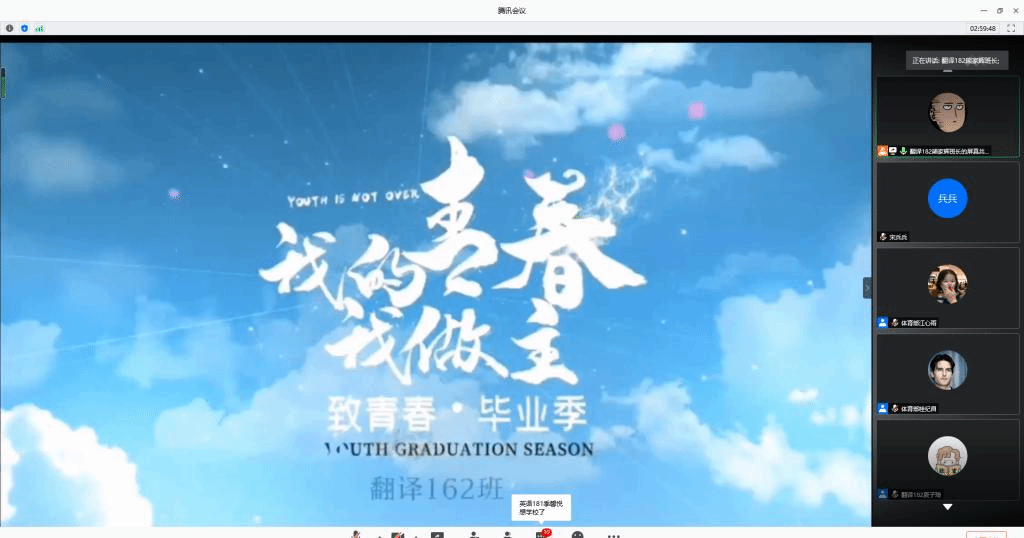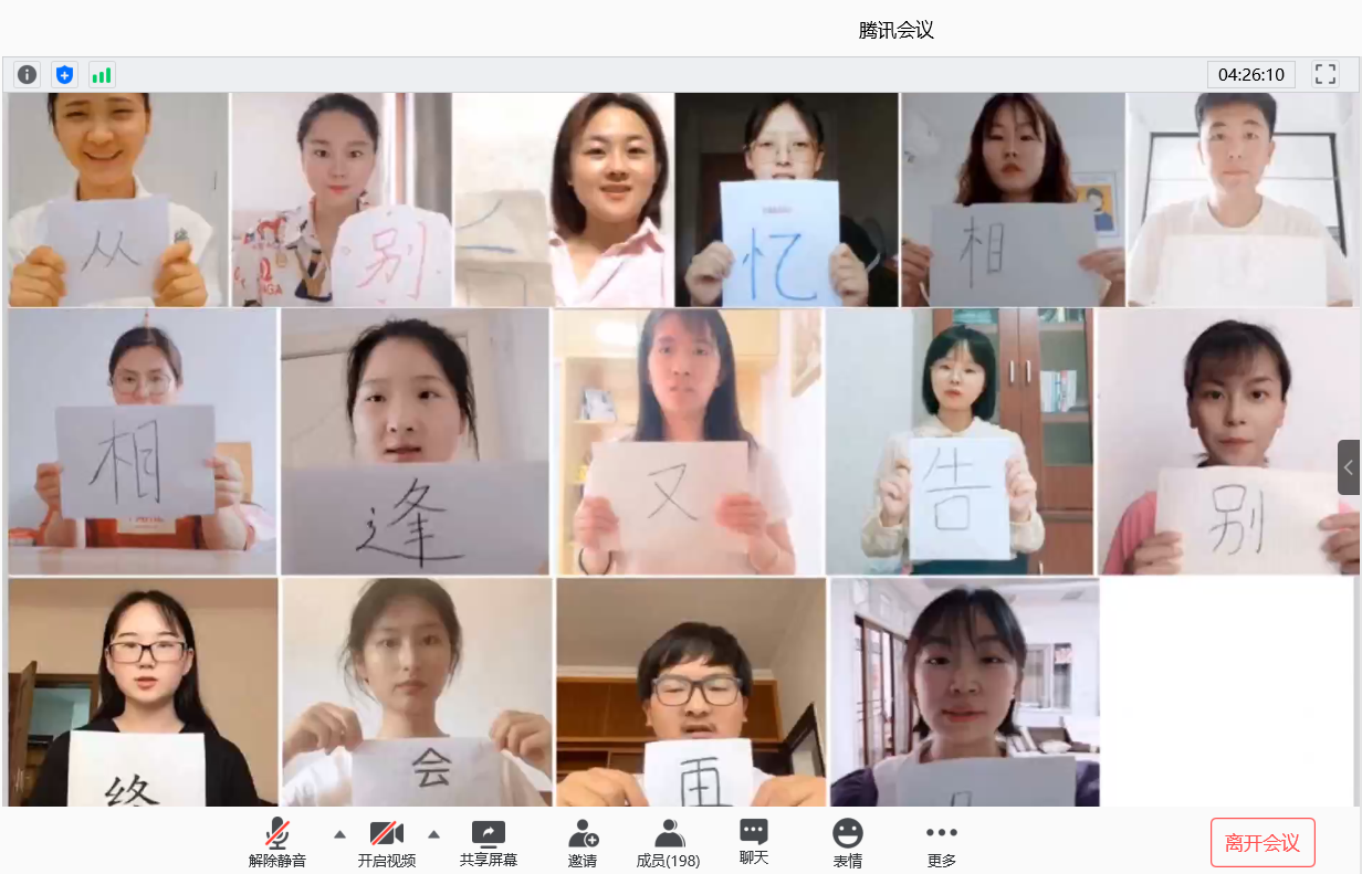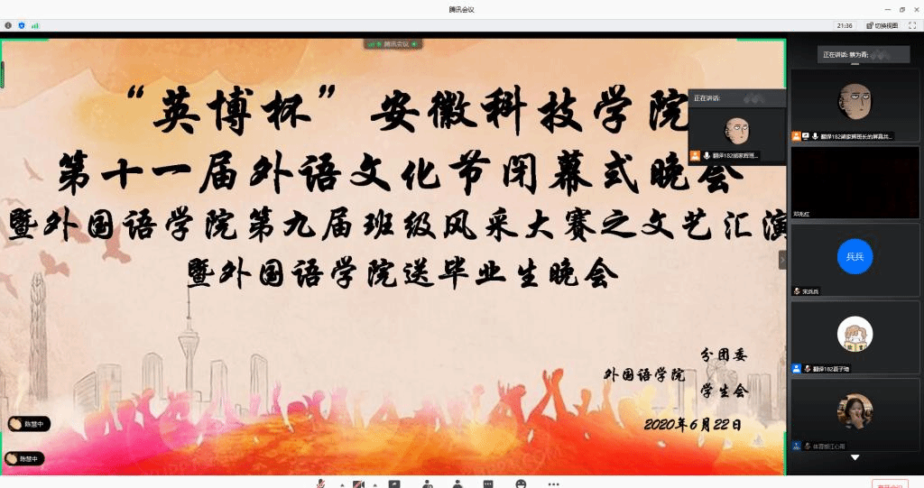 6月22日晚,外国语学院在腾讯会议上举行了“英博杯”开云线上官网_开云(中国)第十一届外语文化节闭幕式晚会暨第九届班级风采大赛文艺汇演暨送毕业生晚会。外国语学院院长陈德用、党总支书记蔡为青、副院长刘萍及师生代表参加。此外,班级风采大赛文艺汇演邀请动物科学学院学生会主席孙静、资源与环境学院学生会主席吴柳莹、人文学院学生会主席徐鹏飞,外国语学院六届二任学生会主席杨妍,英语162班班长张寻、外国语学院六届一任学生会文艺部部长宫思远、翻译161班团支书陈慧仁7名同学担任评委,晚会由英语182班刘珍珍和翻译182班胡玉辰2位同学主持。