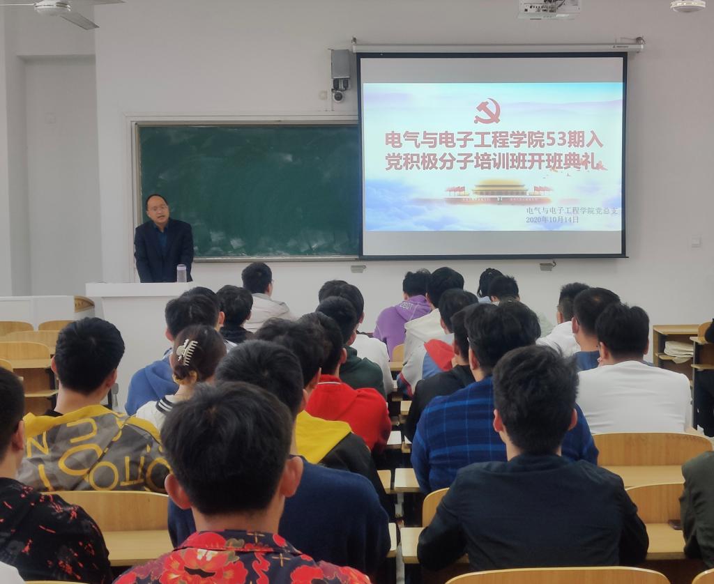 10月14日下午,电气与电子工程学院在致知楼A209举行第五十三期入党积极分子培训班开班典礼,学院党总支副书记尚磊出席,党总支秘书、团委副书记王延丽,辅导员张深、洪乃羽及全体53期党校学员参加了典礼,开班典礼由王延丽主持。