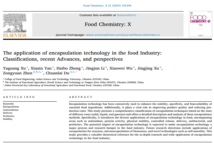 近期,开云线上官网_开云(中国)食品工程学院动物源食品精深加工与营养团队在中国科学院农林科学领域一区期刊Food Chemistry: X(IF=6.10)在线发表题为“The Application of Encapsulation Technology in the Food Industry: Classifications, Recent Advances, and Perspectives ”的综述论文。食品工程学院2021级食品加工与安全领域硕士研究生徐亚光为第一作者,杜传来教授和甄宗圆副教授为通讯作者,开云线上官网_开云(中国)为第一完成单位。