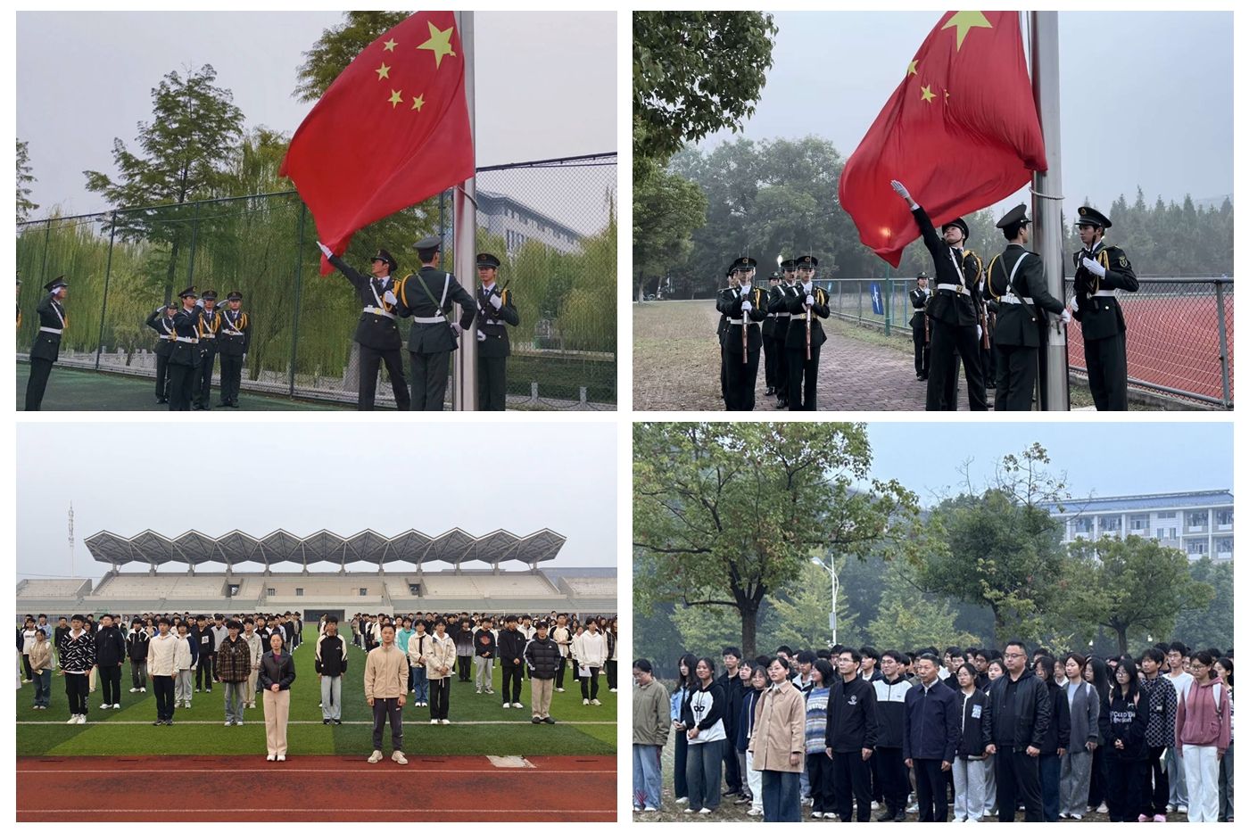 6点40分,东方的地平线上,一抹淡淡的晨曦悄然探出,校国旗护卫队的队员们迈着整齐划一、铿锵有力的步伐,目光坚定地将国旗护送至升旗台前,伴随着激昂的国歌声响起,五星红旗在晨曦下飘扬。全体师生肃立,面向国旗行注目礼。