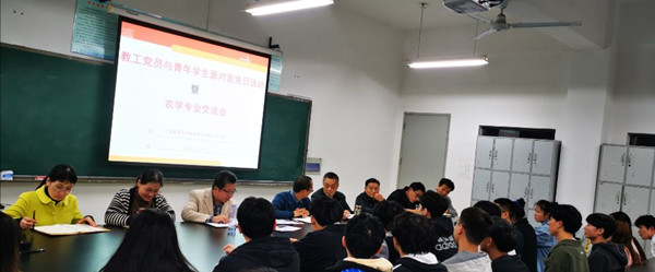 为了充分了解学生的专业思想,强化学生对“爱农、兴农、强农”的理解,11月18日下午,“教工党员与青年学生面对面党日活动暨农学专业交流会”在两个地点同时进行,活动在农学院育种和栽培教研室教工党支部党员和19级农学专业学生间展开。