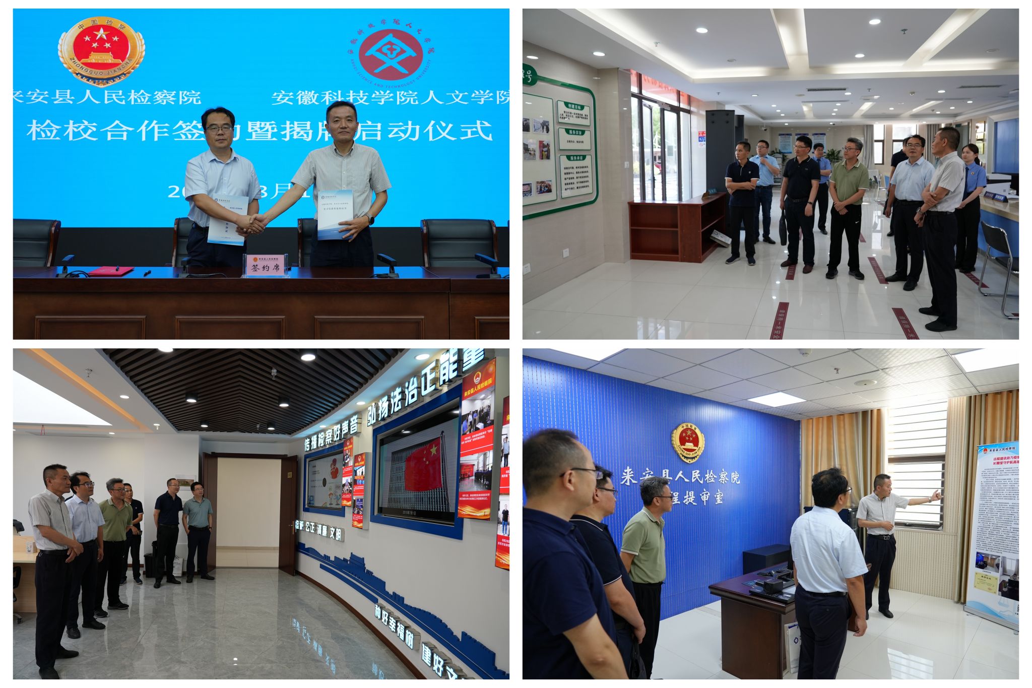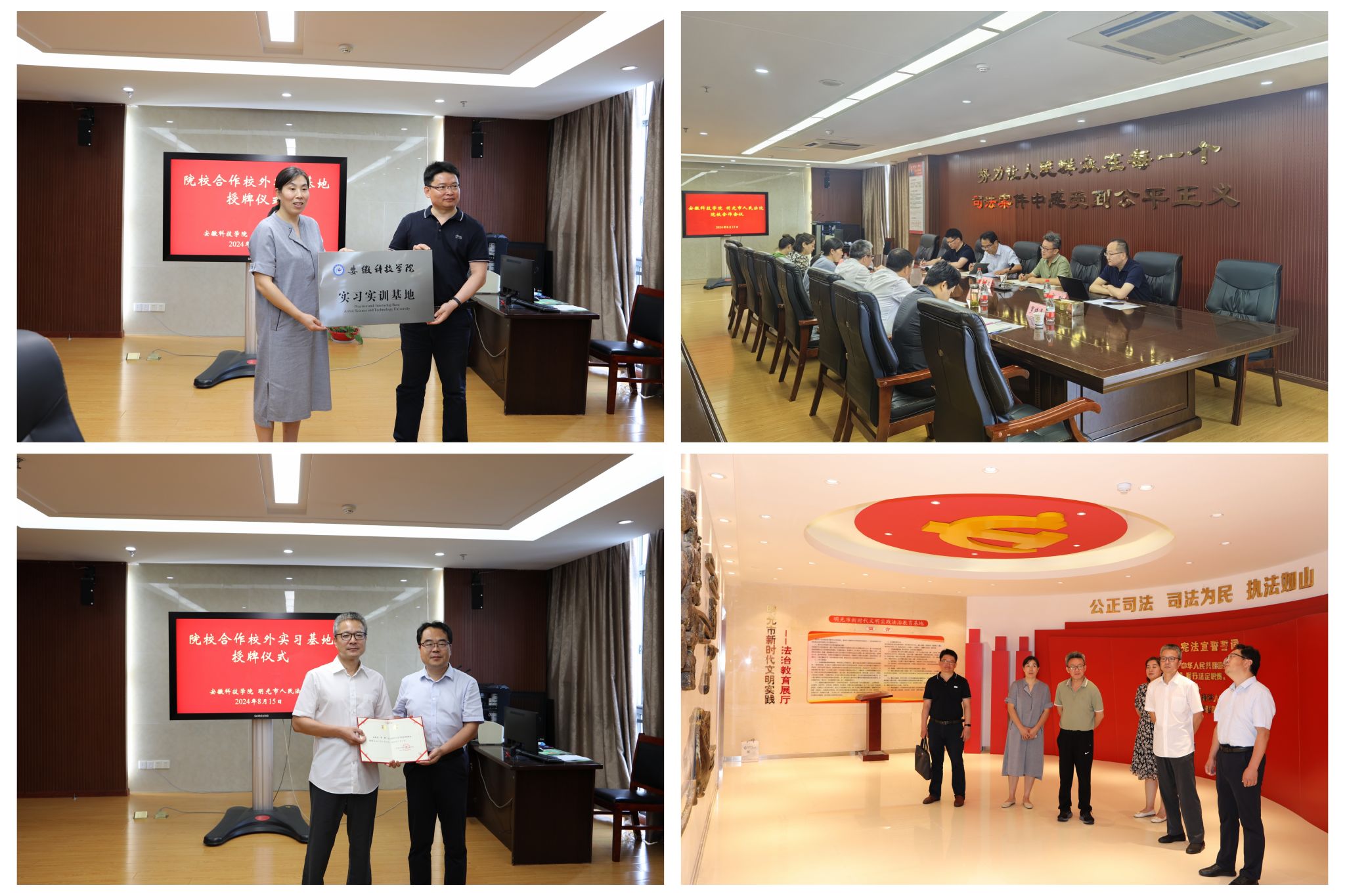 为加快推进2024届和2025届毕业生高质量充分就业,广泛听取用人单位对法学专业人才培养的意见和建议,8月15日,人文学院党委副书记、院长李晓东、正处级组织员张严政、副院长牛永辉、模拟法庭实验室主任宣刚,赴明光市人民法院和来安县人民检察院开展访企拓岗和共建合作交流,举行实习实训基地授牌仪式和校检合作签约仪式,为相关人员颁发特聘教授证书。