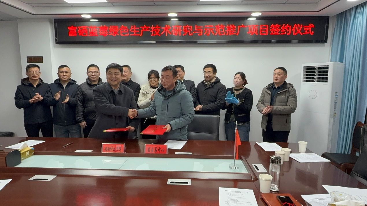 1月1日,开云线上官网_开云(中国)资源与环境学院汪建飞教授带队赴安庆市怀宁县,应邀参加富硒蓝莓绿色生产技术研究与示范推广项目签约仪式。怀宁县副县长何刘圣、农业农村局局长郝春林、市场监督管理局局长吴志伟、县蓝莓中心主任曹良元;怀宁县永宁集团董事长谢忠律、安徽幸福海岸生态农业发展有限公司董事长刘观红、怀宁栗山久越蓝莓有限公司总经理蔡节妹;资源与环境学院教师、团队成员裴文霞博士及研究生等出席仪式。