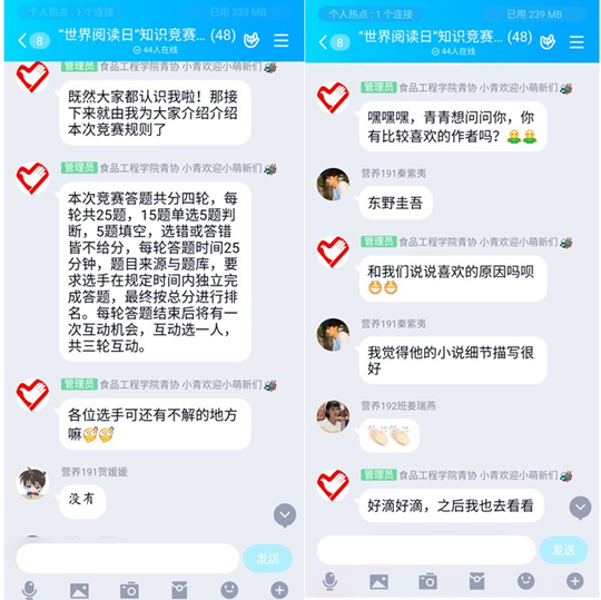 活动初始,由青年志愿者协会副会长张永卓向大家介绍了比赛规则。本次竞赛答题共分四轮,要求选手在规定时间内独立完成答题,最终按总分进行排名。每轮答题结束后将有一次互动机会,互动选一人,共三轮互动。第一轮互动形式是通过QQ小程序群抽签抓阄,抽中卡片的幸运儿将会获得网薪奖励,第二三轮则是通过抢红包形式进行的,手气最佳也会获得网薪奖励,同学也都积极参与其中并且向大家分享了自己喜欢的书籍或作家。在四轮答题完毕后,本次竞赛活动也到了尾声。