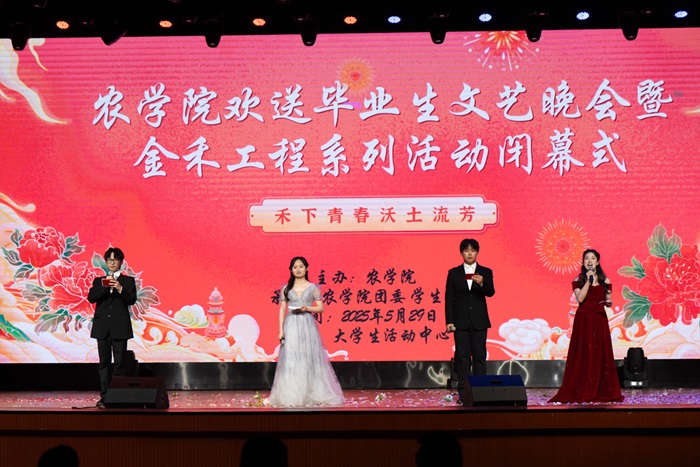 5月29日,以“禾下青春 沃土流芳”为主题的农学院欢送毕业生文艺晚会暨金禾工程系列活动闭幕式在大学生活动中心举行。“喜田植保”班校外班主任、农学院优秀校友、合肥喜田生物农药有限公司总经理韩松,校教务处副处长、创新创业学院副院长(主持工作)舒英杰,农学院党政领导、师生代表以及留学生等300余人观看晚会。