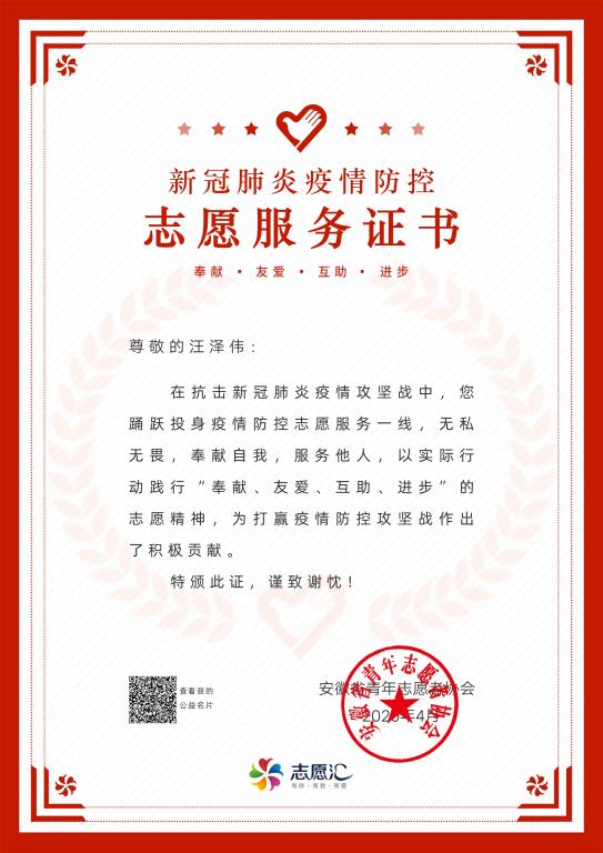 汪泽伟,男,汉族,中共预备党员,1998年12月出生于安徽宣城,现为电气与电子工程学院电子信息工程专业17级学生。多次荣获省级、校级“优秀青年志愿者”称号,疫情期间由于表现突出受到安徽省青年志愿者协会的表彰。