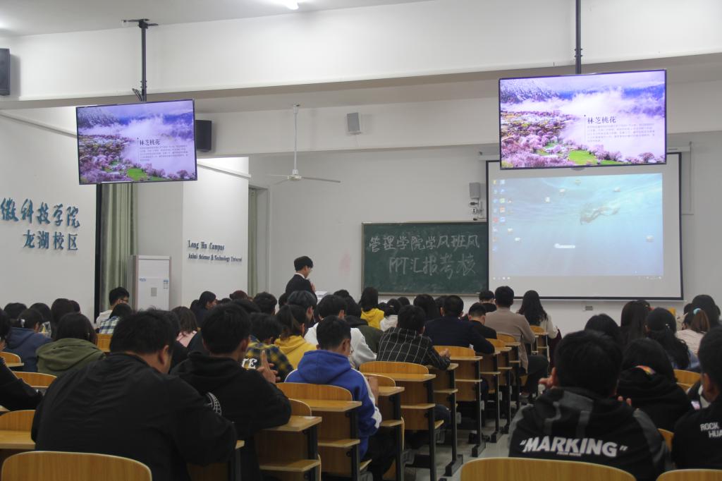 本次比赛共有18、19级14个班级参与,每个班级的汇报人从班级的组织建设、期末考试挂科情况、考试违纪情况、出勤率、英语四六级通过率及未来学习发展计划等方面进行PPT汇报展示。比赛现场,各班级汇报人一一汇报自己班级一年来学风班风建设情况,并将相关建设方案、过程中出现的问题和应对方式作了说明分享。最终,由工商管理182班和物流管理191班获得了本次比赛的一等奖。