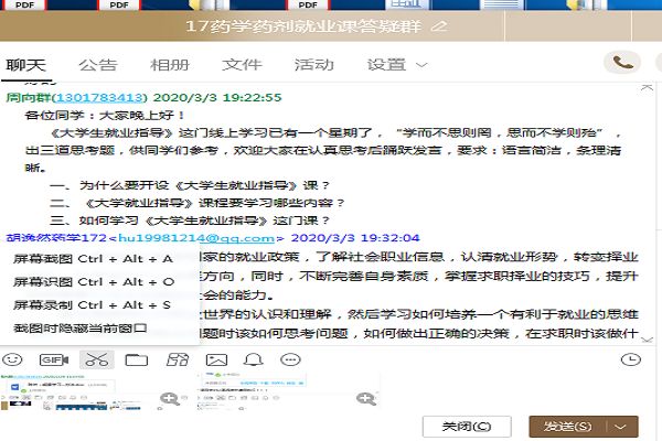 线上答疑如火如荼。为了更好地指导学生完成在线学习,各位任课教师通过课程答疑QQ群及时和学生展开沟通,详细讲解课程的学习目标、学习要求、线下作业、线下考核等课程内容。在答疑群中布置课程学习任务,督促学生任务完成情况,重点讲解相关理论,有效指导学生高效学习。