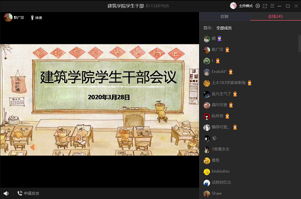 为进一步做好学生疫情防控工作,确保学生工作有序进行,建筑学院于3月28日通过群课堂召开学生干部会议。建筑学院分团委书记耿广汉,辅导员沈德艳、阮怀思出席会议,学院团委委员、学生会干部、各班级班长、副班长、团支书、学习委员、生活委员、易班班长参加会议。会议由沈德艳主持。