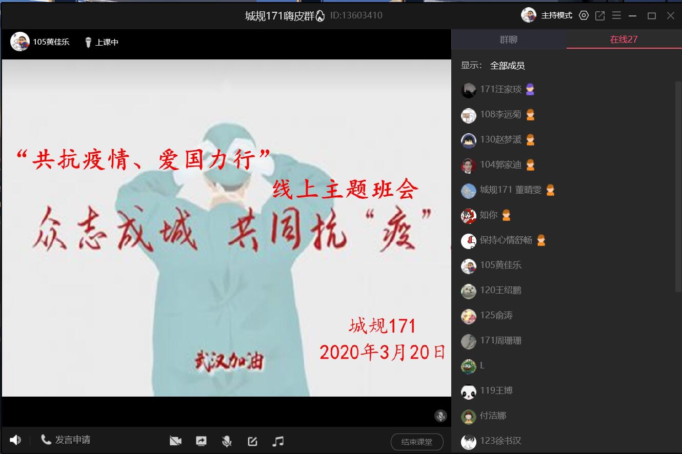 城乡规划171班开展了一场别开生面的线上讨论,在线分享了身边“共抗疫情”的生动故事,有战“疫”一线的志愿者,有守护后方的身边人,还有营造良好舆论氛围的网络宣传员,他们以赤子之心、爱国之行在这场疫情大考中提交了优异的答卷。