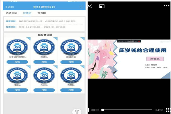 活动期间,同学们积极参与、热情高涨,充分发挥自己的理财能力和规划理念,对自己的压岁钱进行科学理财规划。经过初赛的筛选,共有6支队伍进入决赛,决赛以视频加讲解的方式进行。此次比赛中村花队因视频制作精良,图文并茂,学习生活花费各有支出,且数额明确,获得本次比赛的一等奖,压岁钱的刚性队和搬砖队获得二等奖,嘻嘻哈哈队、白白队和白票队获得三等奖。