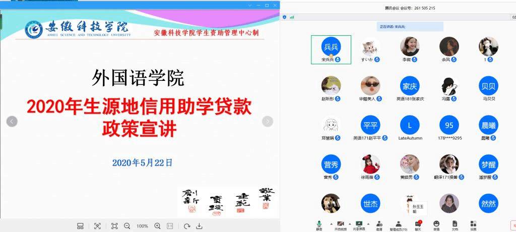 为帮助学生了解助学贷款政策,做好2020年助学贷款申报工作。5月22日晚,外国语学院通过腾讯会议举行资助“两节课”之生源地助学贷款培训,学院2017至2019级各班资助委员、所有申报助学贷款的学生参加本次培训会,会议由学院资助工作联系人宋兵兵老师主持。