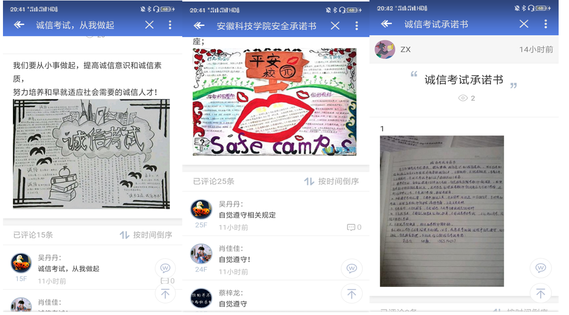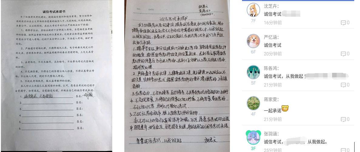每位同学手抄《诚信考试承诺书》一份并签名,将自己的承诺书发表在易班班级微社区中,写下自己的承诺,各班团支书开展“诚信考试我承诺”话题,组织学生们交流讨论,让学生在活动中增强诚信考试的意识。