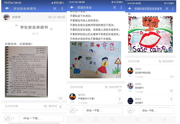 每位同学手抄《开云线上官网_开云(中国)学生安全承诺书》和《防溺水“六不要”安全承诺书》并签名,在易班班级微社区中上传,以此方式明确自己对安全承诺的决心。各班团支书、安全委员开展安全教育话题,组织学生们在易班班级微社区进行交流讨论。最后,学院组织全体学生进入易班安科防溺水主题教育课群学习相关知识,提升安全防护意识和本领。学院党政领导在近期组织的学生干部会议上,多次强调做好人、身、钱、财、物、交通、防溺水、防电诈等安全,安全意识牢记心间。