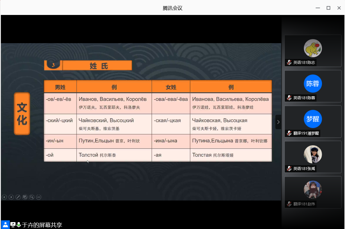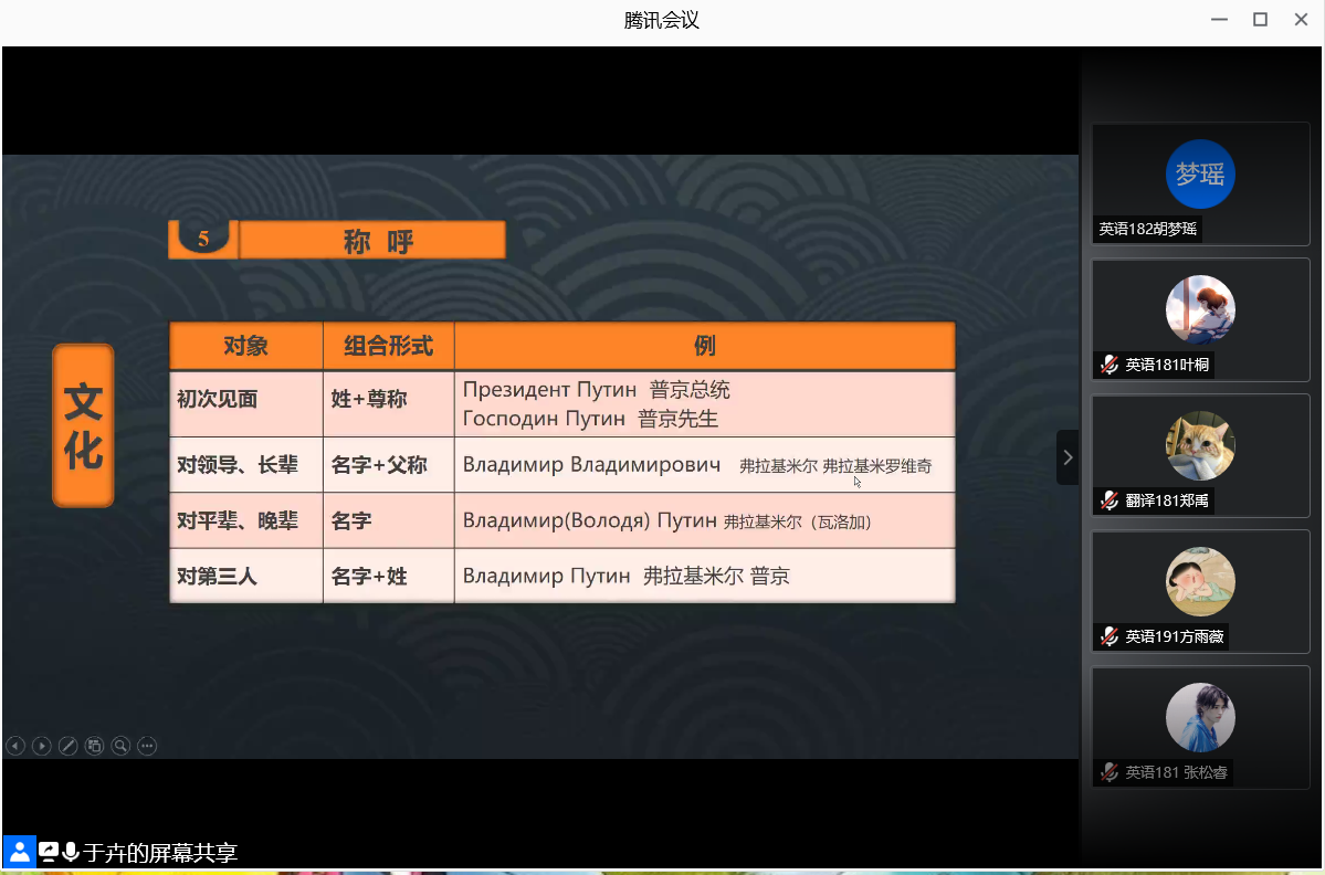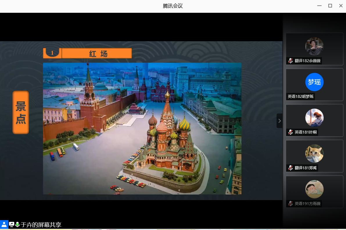 为进一步丰富外国语学院学生校园文化生活,拓宽学生对俄罗斯文化的了解和认识,领略俄罗斯的风情,外国语学院于6月17日晚上,利用腾讯会议,举行“英博杯”开云线上官网_开云(中国)第十一届外语文化节之俄罗斯风情讲座。本次讲座邀请校教务处于卉老师担任主讲人,外国语学院18、19级全体学生参加,外国语学院专职辅导员宋兵兵老师主持本次讲座。