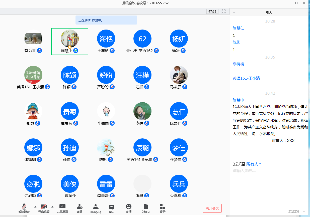 接着,全体毕业生党员观看了防腐犯罪教育视频,了解了职权犯罪的概念、预防职务犯罪及避免职务犯罪等相关知识,引导毕业生党员们进一步坚定廉洁信念,增强未来在工作中的防腐抗腐能力。最后,全体毕业生党员在蔡为青的带领下,重温入党誓词,每个党员回到自己曾经庄严宣誓的那一刻的“初心”,激励学生党员不断增强党性意识,时刻以党员的标准严格要求自己,不忘初心、牢记使命。