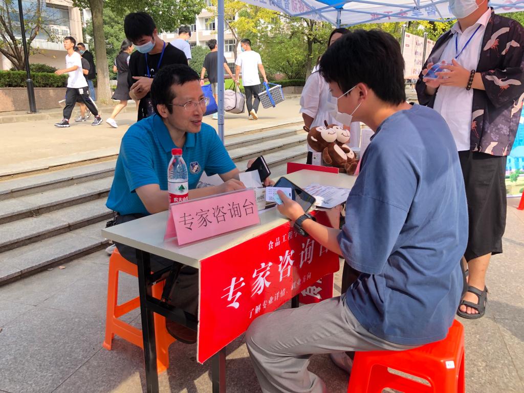9月16号,食品工程学院迎新工作在如火如荼地进行着。在迎新现场,我们可以看到此次食品工程学院迎新的一大特色,即在新生报到处专门设置了专业咨询台。由食品工程学院桑宏庆、杨剑婷、张献领、李景军四位专业老师身体力行地在咨询台与学生进行专业学科的交流。