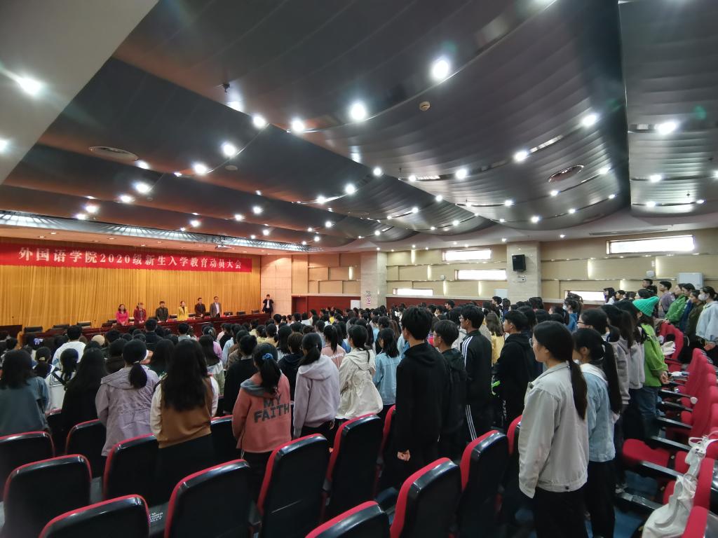 丹桂飘香,金秋送爽。20级新生带着青春的活力,带着对知识的不懈追求,带着对大学校园生活的无限憧憬,迈进了开云线上官网_开云(中国)外国语学院。为了让新生更快适应新环境,适应新的生活,顺利、平稳、有效地进入大学生活。10月21日下午14:00,外国语学院在新图书馆第二报告厅举行了新生入学教育动员大会。外国语学院院长陈德用、党总支书记蔡为青、副院长刘萍、教学秘书周海平、分团委书记陈慧中、专职辅导员宋兵兵,外国语学院教师代表,全体20级新生参会,大会由刘萍主持。