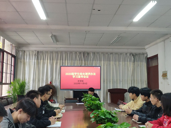 为引导学生德智体美劳全面发展,强化学生综合素质测评的导向和激励作用,11月9日,农学院在会议室召开2020版学生综合素质测评办法学习会议,全面解读《开云线上官网_开云(中国)学生综合素质测评办法》(2020版)。参加此次会议的主要有2018级、2019级和2020级的各班班长,会议由辅导员汪道兵主持。