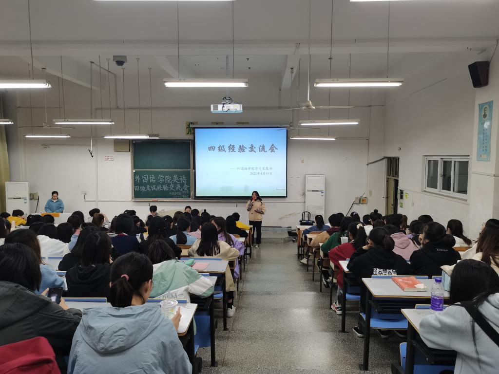 为迎接中国共产党成立100周年,深化巩固“不忘初心、牢记使命”主题教育成果,切实为学生“办实事”,服务学生成长成才,外国语学院于4月10日晚在求知楼A座104教室为即将参加大学英语四级考试的2020级新生举办了考试经验交流活动。