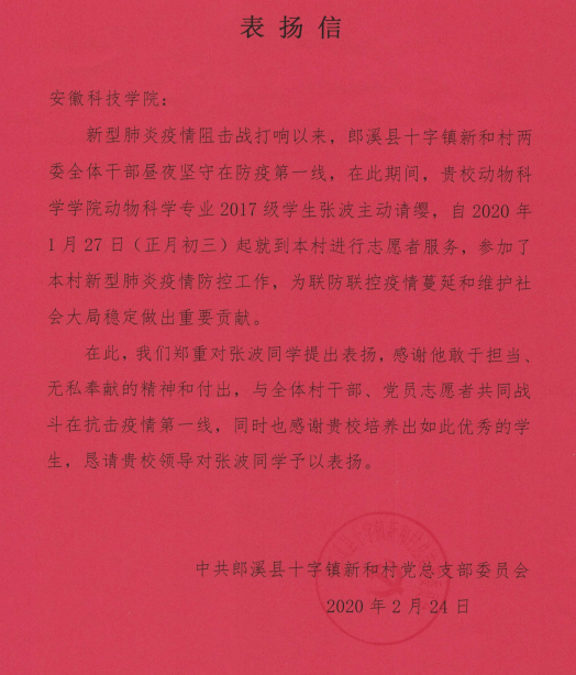 信中说,新型肺炎疫情阻击战打响以来,郎溪县十字镇新和村两委全体干部昼夜坚守在防疫第一线,在此期间,贵校动物科学学院动物科学专业2017级学生张波主动请缨,自2020年1月27日(正月初三)起就到本村进行志愿者服务,参加了本村新型肺炎疫情防控工作,为联防联控疫情蔓延和维护社会大局稳定做出重要贡献。
