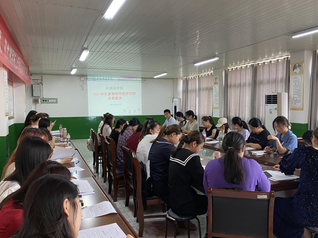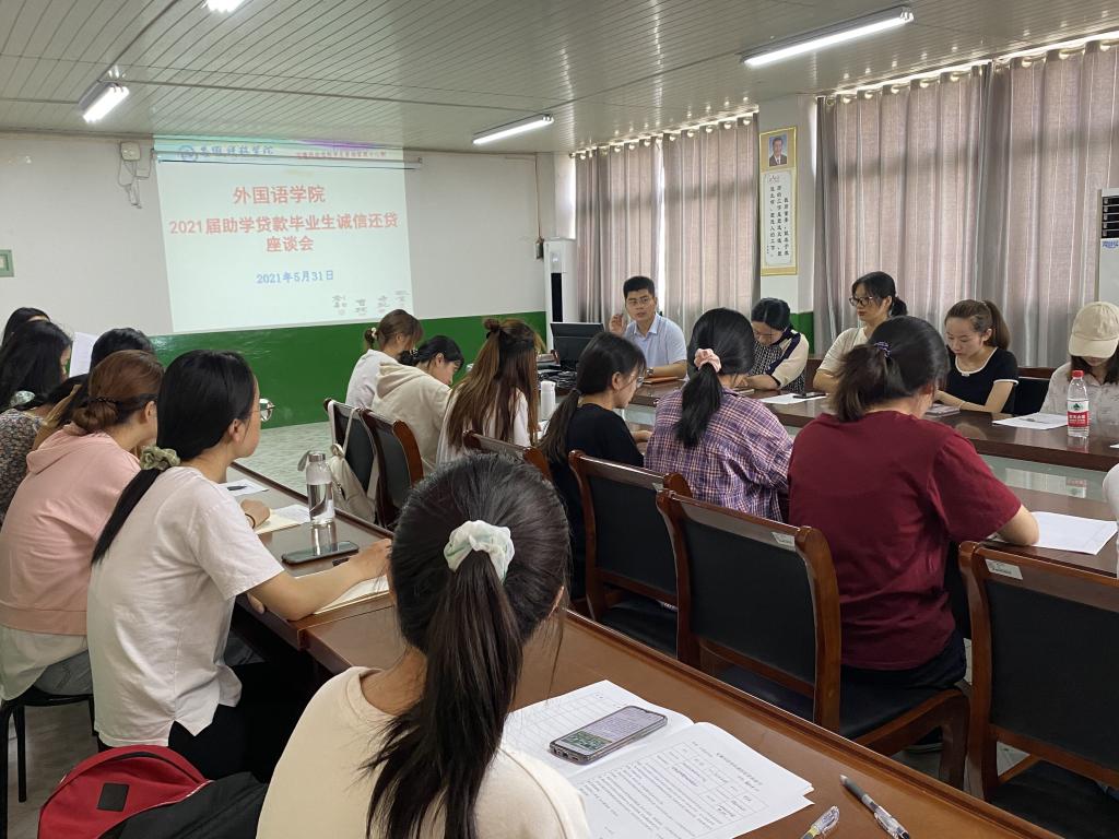为巩固党史学习教育成果,推动“我为群众办实事”,服务学生成长成才,培养家庭经济困难学生诚信感恩意识,践行诚信感恩行动,达到资助育人实效。5月31日上午,外国语学院在学院会议室举行助学贷款毕业生“感恩助学 诚信还贷”座谈会,2021届各班获得助学贷款毕业生参加本次座谈会,座谈会由外国语学院团委副书记、学院资助工作联系人宋兵兵老师主持。