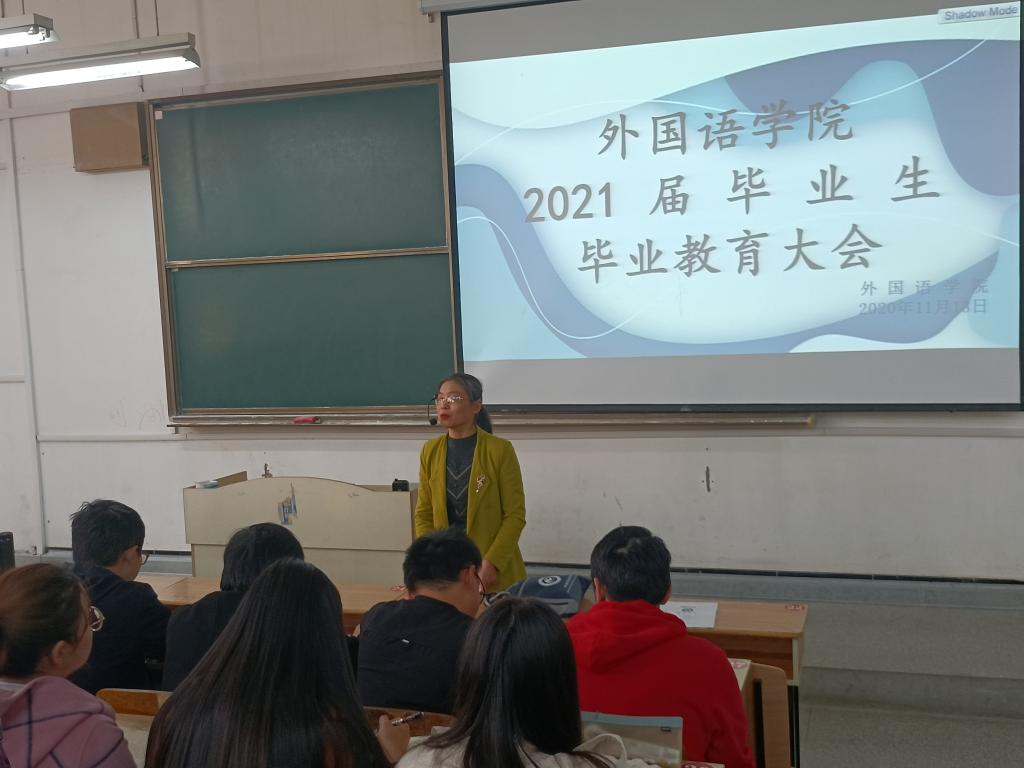 11月18日下午,外国语学院在求A202教室召开2021届毕业生毕业教育大会。外国语学院党总支书记蔡为青、专职辅导员宋兵兵出席大会,学院2021届全体毕业生参加。本次大会由宋兵兵主持。