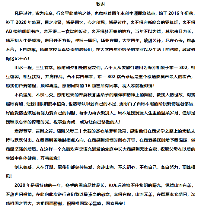 字里行间,深深感恩之情;句读之中,时代青年之风。四年大学,学到的不只是书本专业知识,更有对亲情友情爱情师生之情同窗之谊的感悟,对生活学习的态度,对祖国和人民的热爱。