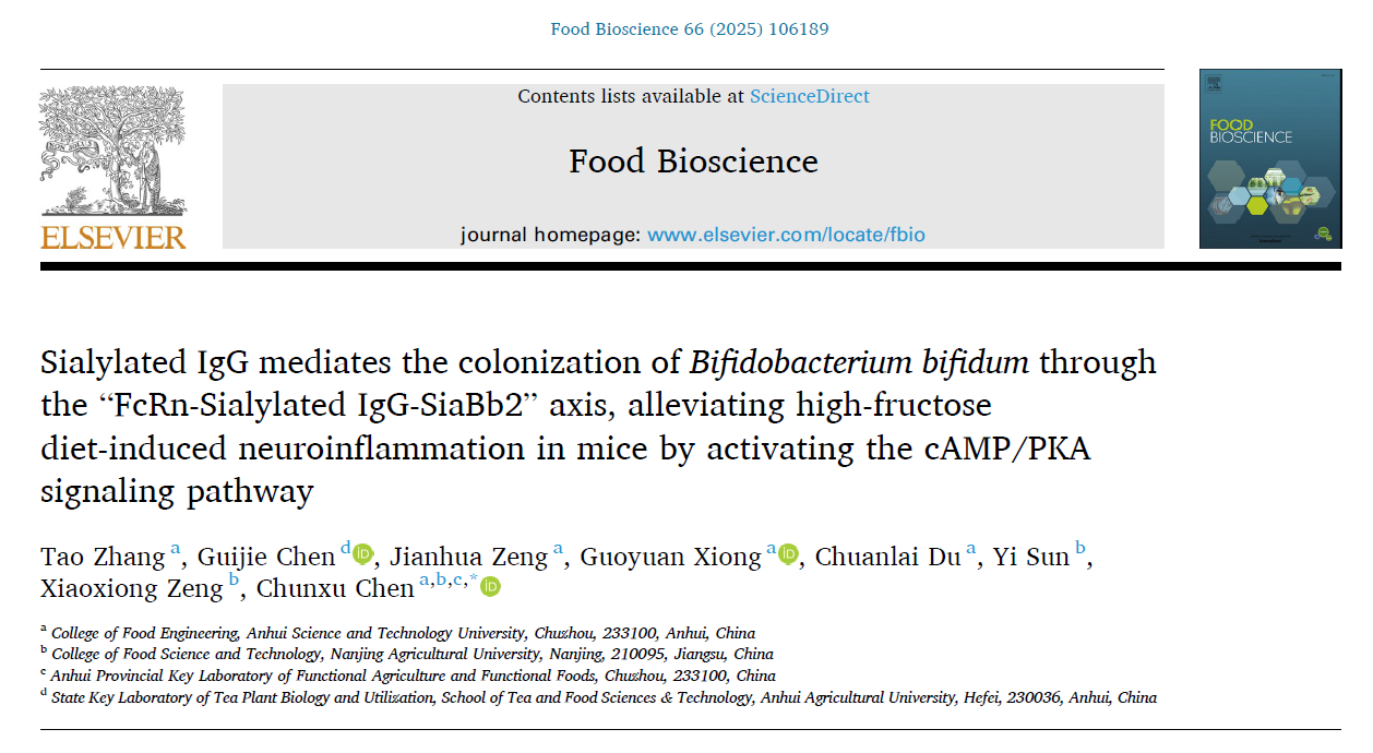 近日,食品科学与工程学院陈春旭副教授以通讯作者身份在国际Top期刊《Food Bioscience》(Q1,影响因子4.8)发表了题为“Sialylated IgG mediates the colonization ofBifidobacterium bifidumthrough the “FcRn-Sialylated IgG-SiaBb2” axis, alleviating high-fructose diet-induced neuroinflammation in mice by activating the cAMP/PKA signaling pathway”的研究论文,论文的第一作者为开云线上官网_开云(中国)2023级食品加工与安全专业硕士研究生张涛,开云线上官网_开云(中国)为第一完成单位,南京农业大学曾晓雄教授课题组为合作单位。