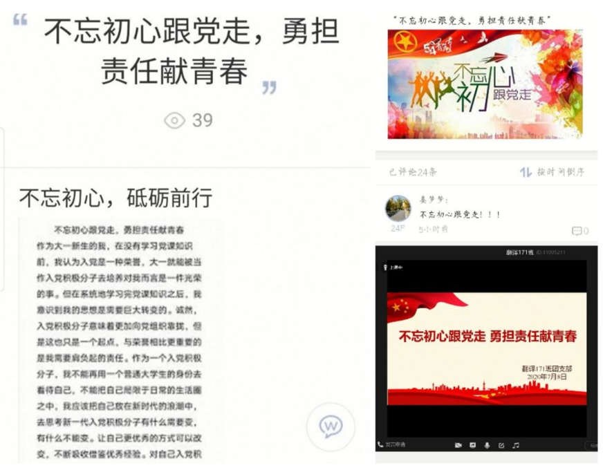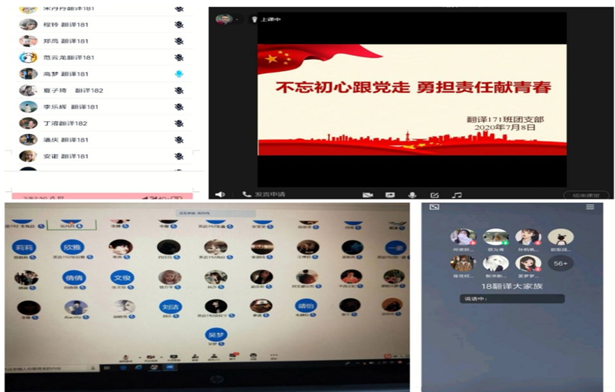 各团支部借助易班、QQ、腾讯会议等新媒体平台,通过“云讲座”,“云论坛”、“云沟通”、“云帮扶”等形式开展了丰富多样的线上主题团日活动,组织同学利用易班等