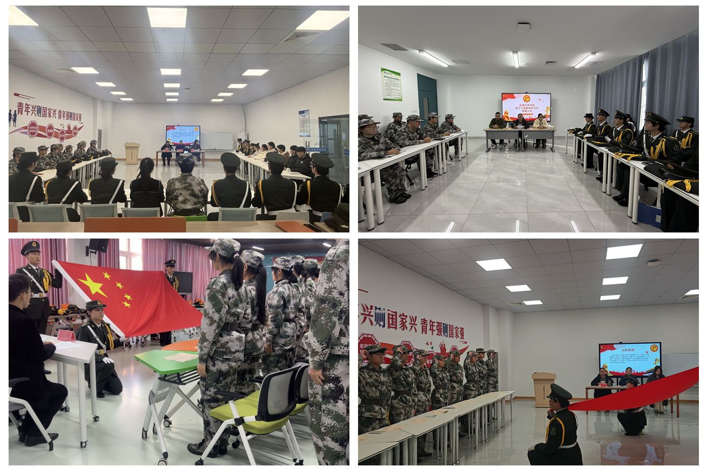 会上,与会老师分别为退役队员、新入职队员颁发了光荣退役证书和新队员聘书并合影留念,第三十届校国旗护卫队全体队员进行了入队宣誓,即将退役的老队员为新入队队员授予军装,退役队员代表发表退役感言、新入队队员代表发表入队感言、新一届国旗护卫队骨干代表作了任职表态发言,新老队员进行了深入座谈交流。