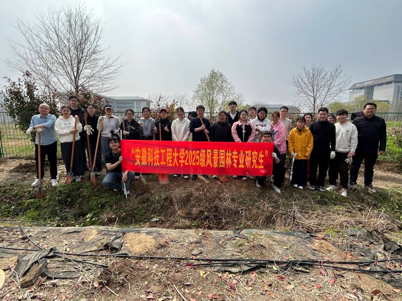 人勤春来早,植绿正当时。为深入贯彻生态文明建设理念,落实全民义务植树要求,将劳动育人与专业实践深度融合,共建绿意盎然的美丽校园,3月20日至21日,恰逢春分时节,建筑学院组织2025级风景园林专业研究生,在学院实践基地开展 “植树添绿,知行合一” 劳动实践主题教育。学院党委副书记谢宜勤,吴燕教授、陈鸿副教授、赵坤坤博士及周安晟老师带队参与,与同学们一起挥锹培土、共植新绿。