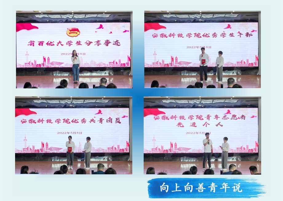 奋斗是青春最鲜明的底色。现场,省百优大学生何依,优秀学生干部代表陈中胜、优秀共青团员代表李好、青年志愿者先进个人代表朱添添等用充满激情的语言、生动鲜活的事例,分享成长历程中闪耀的青春故事,激励广大青年凝聚青春力量,争做“向上向善好青年”。