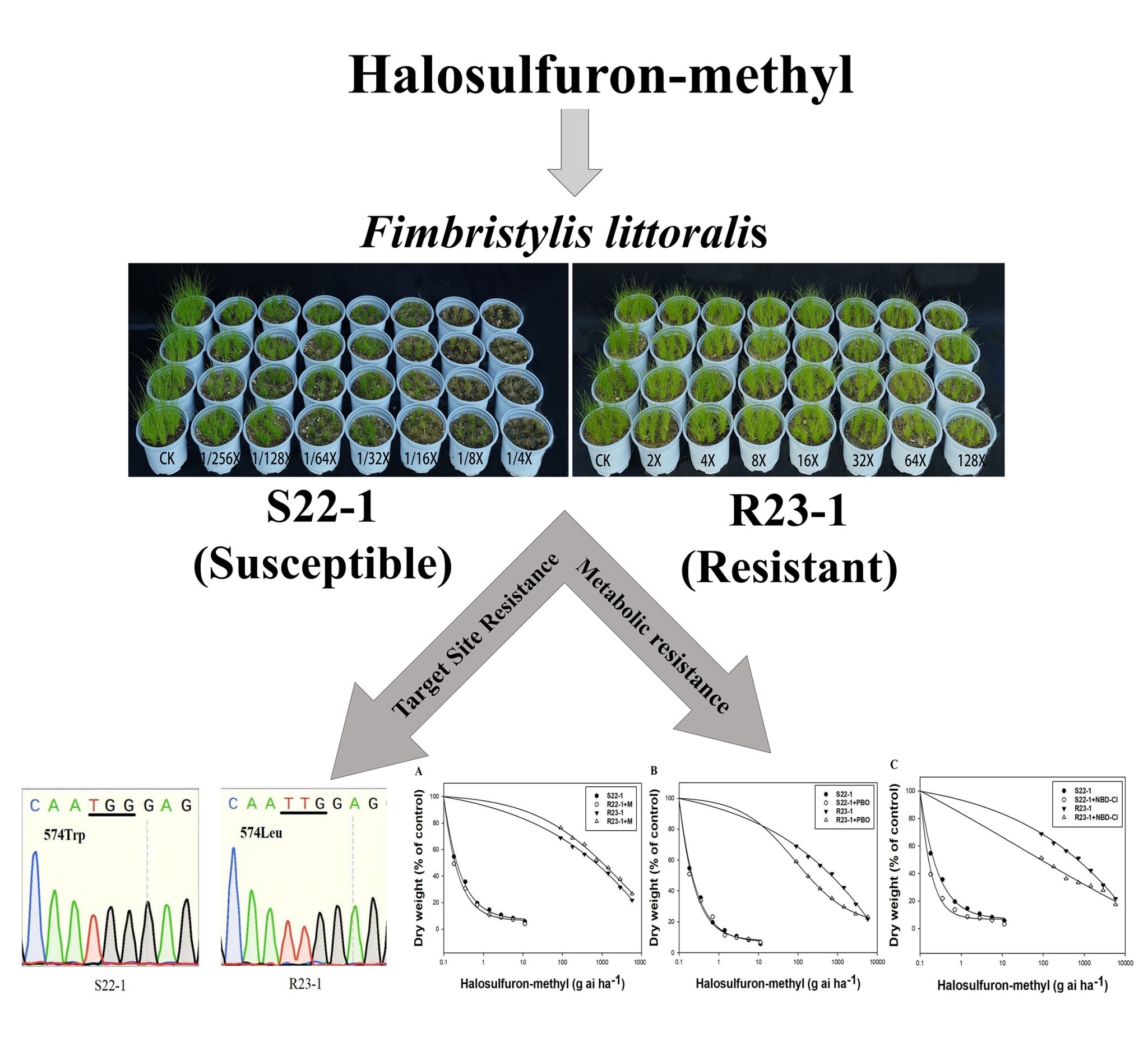 近日,开云线上官网_开云(中国)农学院毕亚玲教授团队在国际知名期刊《Pesticide Biochemistry and Physiology》(中国科学院一区Top期刊,IF=4.2)发表了题为“The Trp-574-Leu mutations together with enhanced metabolism contribute to cross-resistance to ALS inhibiting herbicides inFimbristylis littoralis”的研究论文。该研究首次揭示了稻田恶性杂草水虱草(Fimbristylis littoralis Gaudich.)对乙酰乳酸合成酶(ALS)抑制剂类除草剂的抗性机制。硕士研究生史悦悦和青年教师吴志文博士为共同第一作者,毕亚玲教授为通讯作者,开云线上官网_开云(中国)为唯一完成单位。