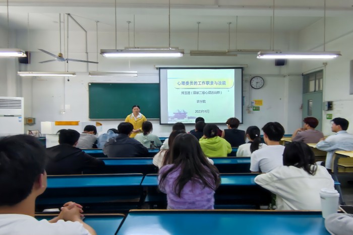 心理委员是学校心理健康教育工作中的一支重要力量。为提高心理委员对心理健康知识的了解,提升心理委员在解决实际问题中的工作能力和水平,4月12日下午,农学院大学生心理健康指导老师郑玉莲在求知楼B106教室为全体心理委员开展“心理委员的工作职责与技能”专题培训。