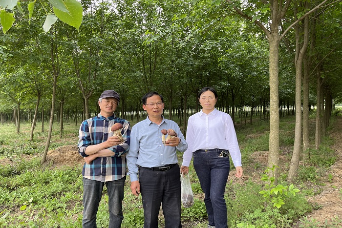 下午何华奇一行又来到位于大路口乡龙湖村的大球盖菇种植基地。该村去年在特派团的指导下于白蜡树下栽培大球盖菇近50亩,此行就栽培管理进行了详细指导,指出了土壤湿度过低导致产量不高的问题。