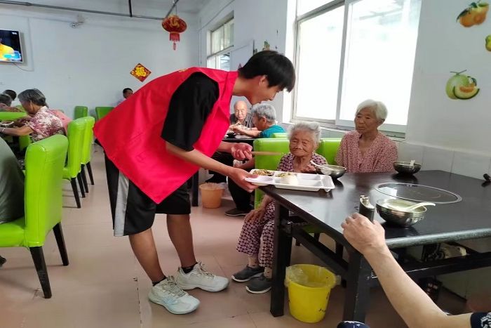 奉献传递快乐,午饭时间到了,志愿者们为爷爷奶奶们端饭、盛汤、收拾餐盘。大家围坐在一起,享受着美味的饭菜,一起谈天说地,整个养老院呈现出“家”一般的温馨氛围。这样的用餐时光让爷爷奶奶们深深地感受到了年轻人的温暖和体贴,享受着短暂的天伦之乐,他们不再孤单和寂寞。