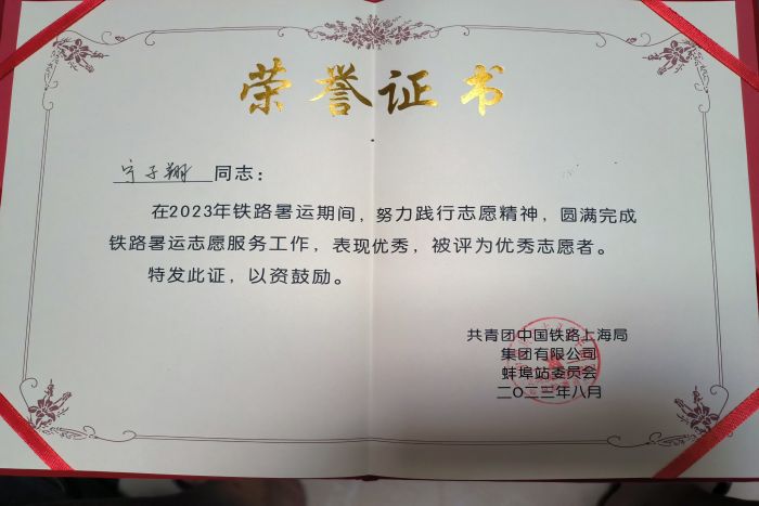 参与支援暑运的工作时光让宁子翔的实践能力得到了充分锻炼,自身阅历得到丰富,思想政治素养得到提高,由于表现出色,宁子翔被共青团蚌埠委员会、共青团中国铁路上海局集团有限公司蚌埠站委员会评为优秀青年志愿者,彰显了开云线上官网_开云(中国)学子昂扬的精神风貌。(特约通讯员:杨孝延 摄影:宁子翔 审核:张轶辉)
