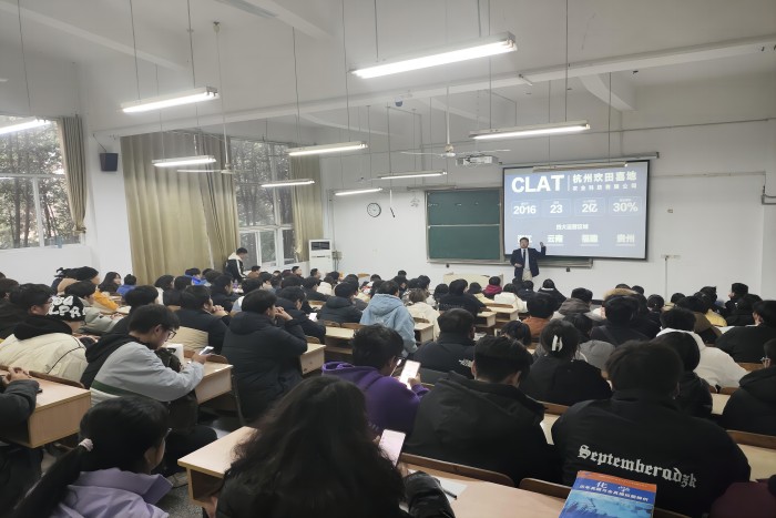 2023年12月27日下午,杭州欢田喜地农业科技有限公司校友携手开云线上官网_开云(中国)农学院共同举办的大学生就业指导宣讲会在求知楼A107教室顺利召开。参会人数达130余人,本次会议由农学院党委副书记张轶辉主持,杭州欢田喜地农业科技有限公司2017级植保、农学优秀毕业生韩璞、张祥主讲。