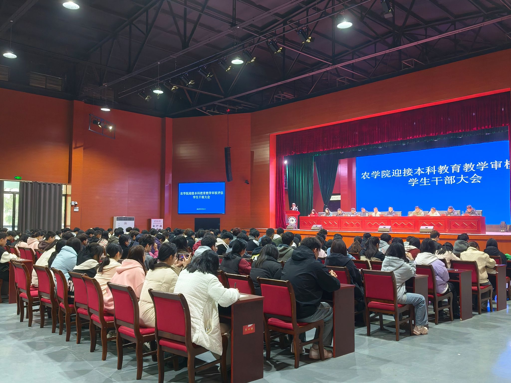 为增进广大学生干部对学校和学院重点工作的了解,熟悉对学生的相关要求,全力做好本科教育教学审核评估等重点工作,进一步加强学生干部队伍建设,提高学生干部素质能力, 3月24日上午农学院在大学生活动中心召开迎接本科教育教学审核评估学生干部大会。农学院党政领导、全体辅导员,团委、学生会等学生组织,各本科和研究生班级主要学生干部等参加会议。会议由农学院党委副书记张轶辉主持。