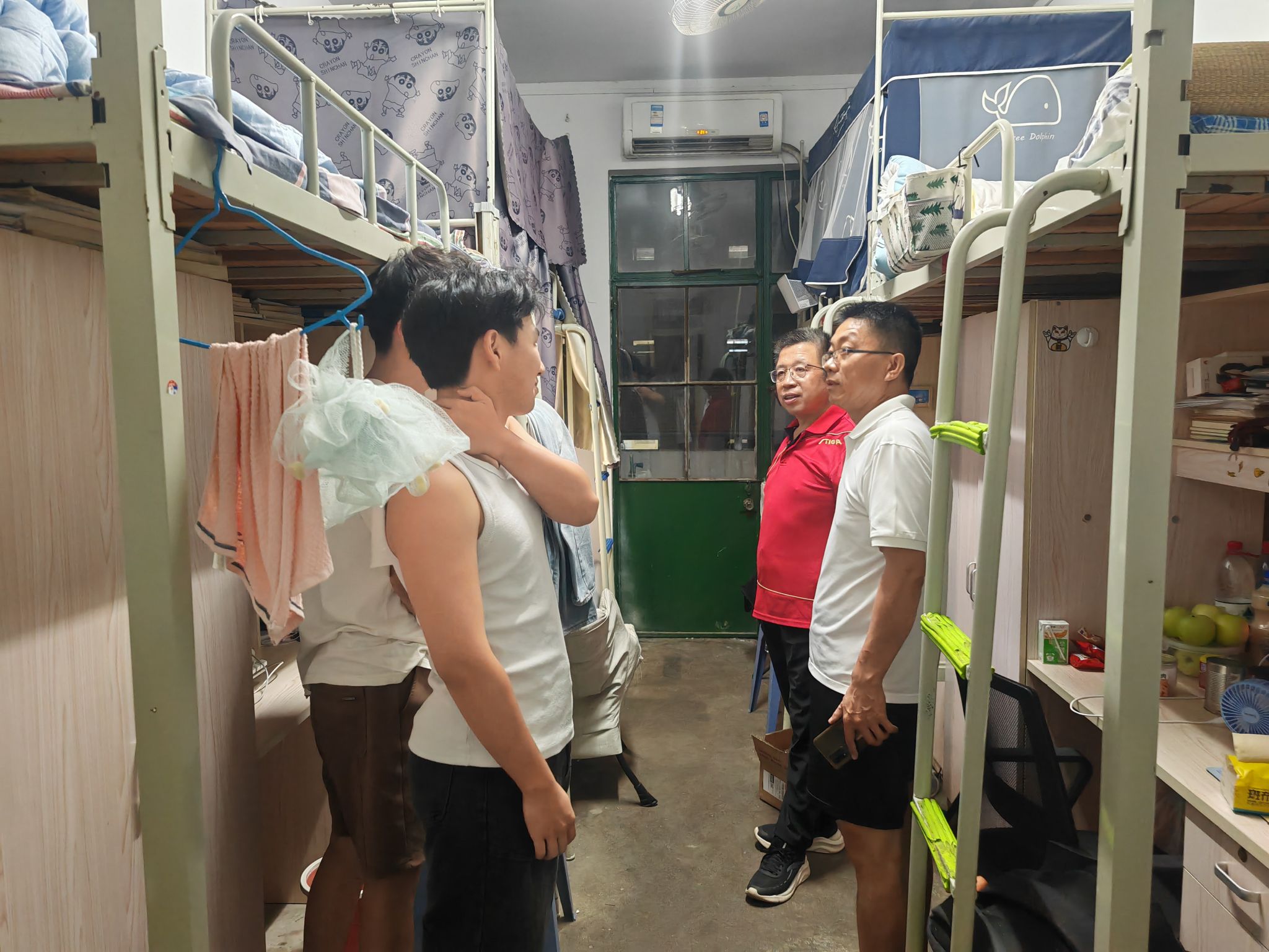 为深入了解暑期留校学生学习、生活和思想状况,加强学生安全教育,切实做好暑期留校学生管理和服务,7月29日晚农学院党委书记何世潮、副书记张轶辉,辅导员汪道兵深入宿舍走访暑期留校学生,进一步加强安全教育、宣传大学生应征入伍政策,关心关爱学生暑期学习生活状况。