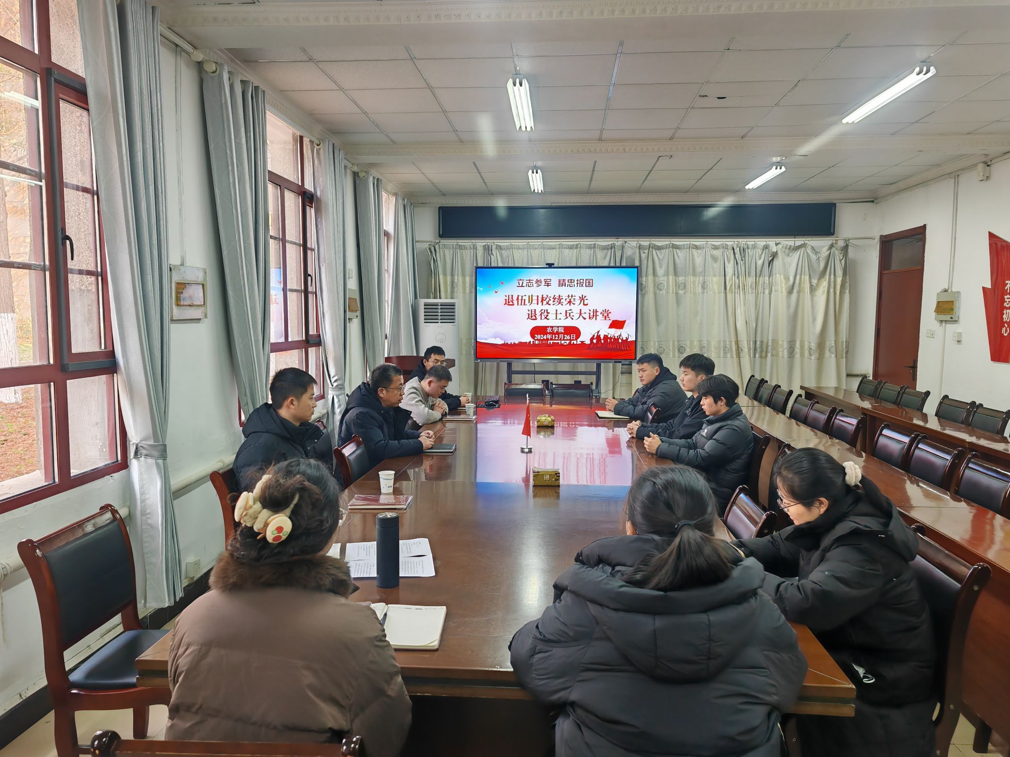 12月26日,农学院在学院会议室举行“退伍归校续荣光”退役士兵大讲堂活动,毕业班辅导员和报名参军入伍的毕业生参加活动,活动由农学院征兵联系人汪道兵主持,学院党委书记何世潮出席活动并讲话。