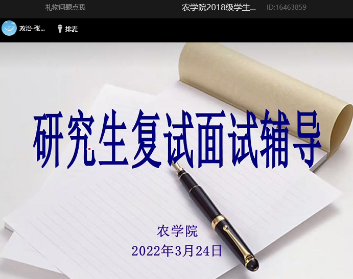 张轶辉借助历年研究生复试面试经典案例,从“如何看待初试成绩、成绩公布后我们该做什么、如何准备复试面试、如果没被录取怎么办”等四个方面详细介绍了复试面试相关环节关键内容。辅导紧扣农学院学生实际,举例丰富,生动形象,并与同学们进行了线上交流解惑,气氛热烈。