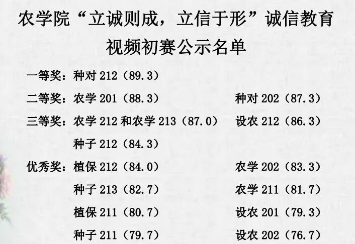 为加强对学生的诚信教育、感恩教育、励志教育,5月27日下午,农学院在求A207举办了以“至诚则成,立信于行”为主题的诚信教育微视频大赛初赛。比赛由农学院学生会生活服务部负责人黄志主持,农学院学生资助工作联系老师薛晶晶、学生会综合部负责人张永佳、田梦真及学院分团委委员徐福祥担任评委。