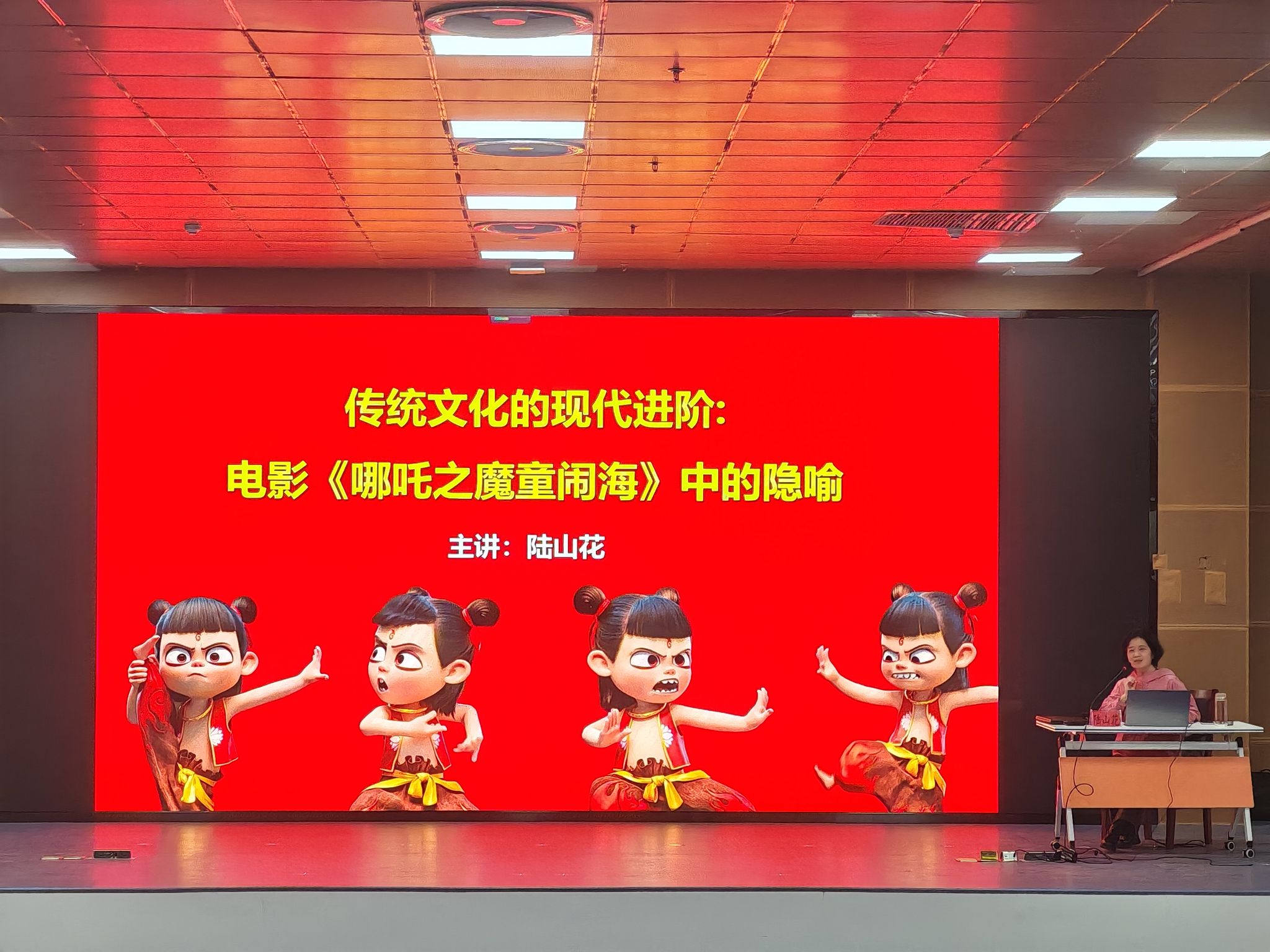 为弘扬优秀传统文化,拓展学生文化视野,4月16日下午,人文学院中文系陆山花老师在图书馆二楼报告厅作了题为《传统文化的现代进阶:电影〈哪吒之魔童闹海〉中的隐喻》学术讲座,讲座由人文学院辅导员徐琦琦主持。