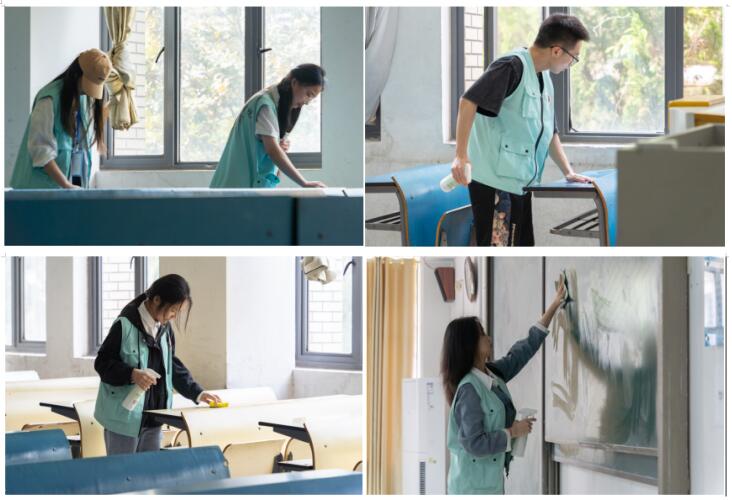 活动开始,人文学院志愿者在新知楼A整队集合,分发抹布、污渍清洁剂等工具后,各成员前往所分配的教室进行课桌、黑板的清理工作。工作井然有序,认真负责,态度友好,同学们积极配合,极大的展示了人文学院的新风采。